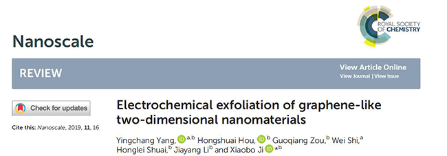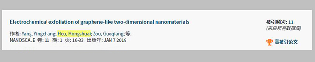 2019年,beat365官网副教授杨应昌博士团队以“Electrochemical exfoliation of graphene-like two-dimensional nanomaterials”为题发表在英国皇家化学会旗下期刊Nanoscale 2019, 11(1): 16-33,(SCI一区,IF=6.97)。该论文入选Essential Science Indicator高被引论文。该论文第一完成单位为beat365中国唯一官网,beat365官网杨应昌副教授为第一作者,中南大学纪效波教授为通讯作者。该成果是beat365官网2019年又一高水平科研成果,对学校“双一流”建设和硕士点建设具有非常重要作用。