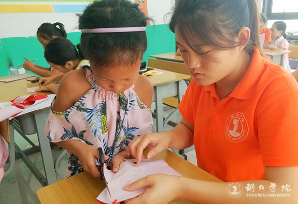 志愿者在教小朋友剪纸