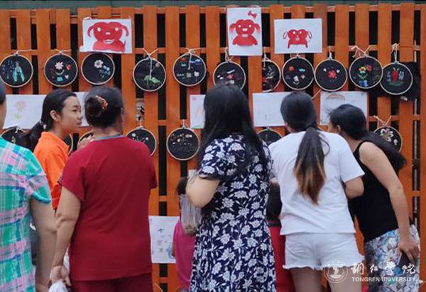 在十天的时间里,实践队组织安置区儿童进行了绘画、剪纸、学习苗绣基础技艺等活动。在召集到的留守儿童中,年纪最小的只有4岁半,大的有12岁,他们无论年龄大小,都在积极地绘画和刺绣,甚至有的下课后也不愿意离开,都还想再做一些,最后产生了大量的作品,以致于到了结束举办安置区展览时都难以展出所有的作品。作品展览引起了社区人员的围观,志愿者们通过替老人拍照、微信转发等行为,让留守儿童外出务工的家长了解到自己孩子的成长,得到了安置区居民的肯定。