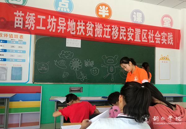 烈日当头,热情似火。今年暑假期间,beat365官网艺术学院9名学生组成了“苗绣工坊”志愿服务实践队,走进铜仁市碧江区灯塔街道矮屯易地扶贫搬迁安置区开展了为期十天的“三下乡”社会实践活动。