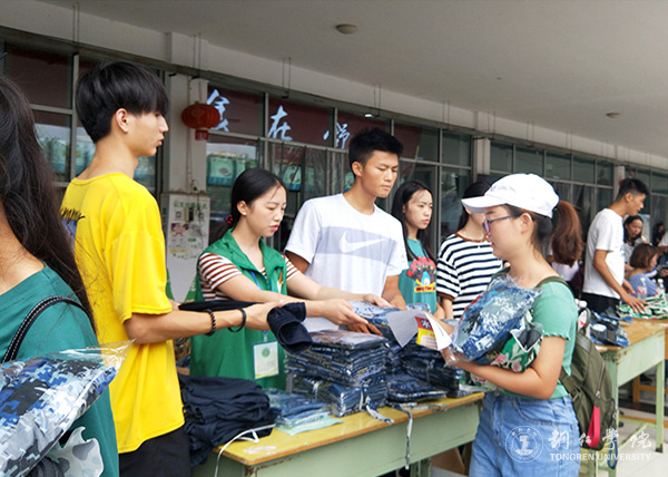 志愿者给新生发放军训服