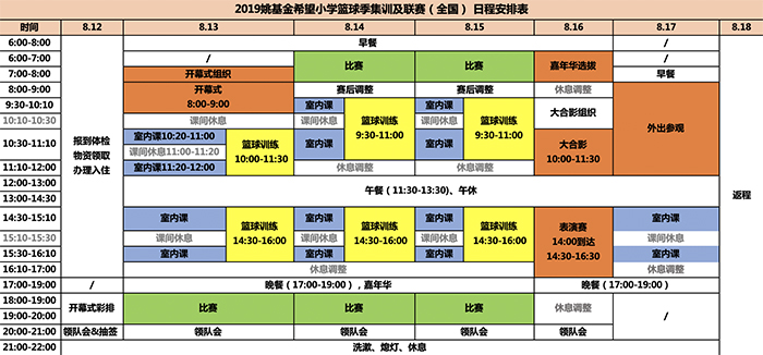 据悉,此次赛事活动包括开幕式、篮球比赛、篮球训练、室内课程、表演赛、嘉年华活动、闭幕式等环节。其中,篮球比赛分10个组同时进行,小组单循环,不设附加赛,组内第一名为圈联赛第一名,以此类推,第四、五名为优胜奖;室内课程将围绕拓展和培养参赛小球员综合素质能力和兴趣,将“以体育人”的篮球理念从赛场延伸到室内,引导小球员在比赛中获得心智的成长;表演赛包括各学校选拔出的小明星球员表演赛、篮球游戏、国内外篮球明星与小球员互动;嘉年华活动包含万豪技巧挑战赛、李嘉诚基金会投篮抢分赛、Nike趣味投篮、NBA关怀行动运球接力赛等。