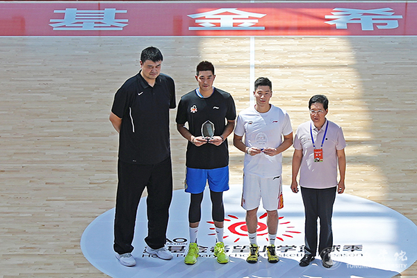姚基金创始人姚明和中国青少年发展基金会常务副秘书长杨晓禹为CBA球队颁发“特别支持单位纪念奖杯”