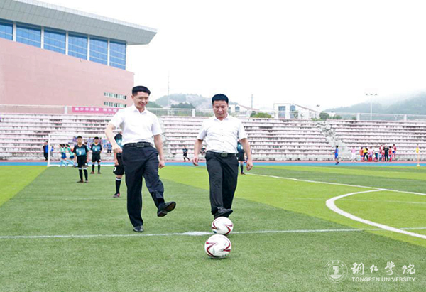 铜仁市教育局党组成员、副局长叶通贤,市文体广电旅游局副局长余晓松共同为比赛开球