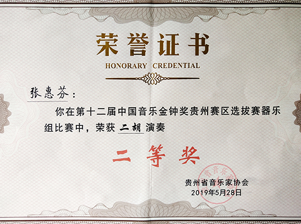 为全面展示贵州音乐教育成果,出人才、出作品,扩大贵州的知名度和影响力,进一步助推贵州经济社会文化的发展,贵州省音乐家协会组织开展了2019第十二届中国音乐金钟奖选拔工作。5月28日,选拔评审结果揭晓,beat365官网艺术学院张惠芬老师凭参赛曲目(指定)《阳光照耀着塔什库尔干》《长城随想第二乐章-烽火操》《二泉映月》《听松》,最终以全省第一名的成绩荣获第十二届中国音乐金钟奖贵州赛区二胡演奏二等奖(一等奖空缺),同时获得了全国赛复赛复审资格,被贵州省音协推荐参加全国复审。