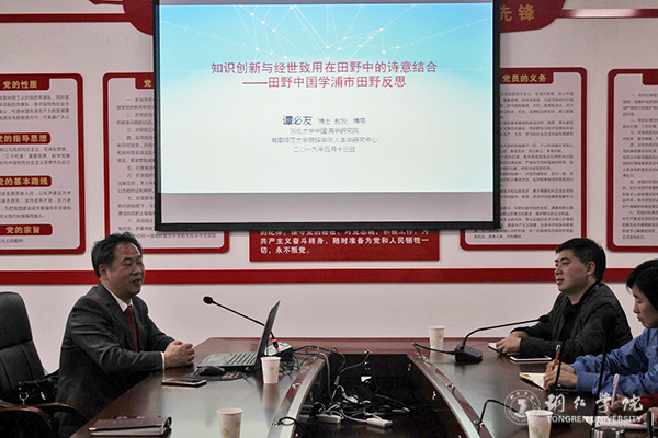 讲座上,谭必友以他带领熤园团队进行的浦市镇田野调研为切入点,从田野中国学的定义、浦市镇田野调研的过程回顾、田野中国学与相邻学科的对话、田野中国学与西方田野学科的对话、田野中国学与严如熤代表的古典田野中国学的对话、田野中国学的田野六个部分讲解了知识创新与经世致用在田野中国学中的完美结合。他的讲座理论丰富、案例翔实,生动解说了田野中国学既突破了西方田野调查热衷于研究异文化的他者范式、重新定义了田野目标与田野成果、在田野基地完成知识创新,又加入了古典田野中国学中经世致用的观念、实现了田野知识的功用。他提出的观点引起了参会老师的极大兴趣,大家就田野调查的相关问题向他请教,他与参会老师进行了现场交流,氛围十分活跃。