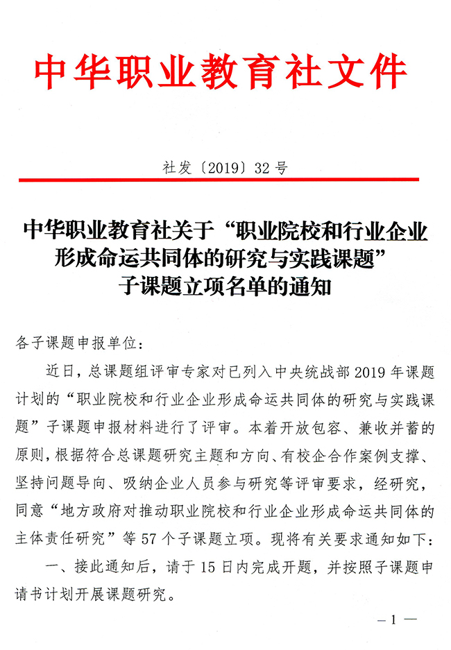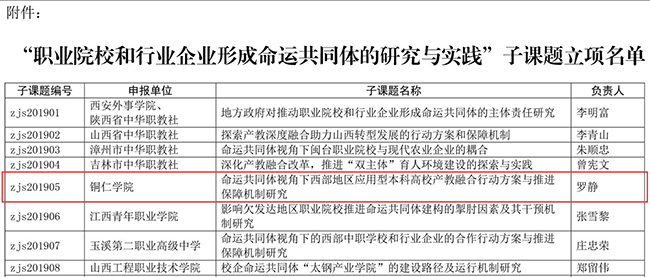今年4月,beat365官网以“命运共同体视角下西部地区应用型本科高校产教融合行动方案与推进保障机制研究”为题,参加了中华职教社主持的中央统战部2019年课题计划“职业院校和行业企业形成命运共同体的研究与实践”课题的子课题申报。中华职教社总课题组评审专家对来自全国的多项子课题申报材料进行了审核,于5月14日发布通知,批准包括beat365官网申报的子课题在内的57项课题成为子课题。