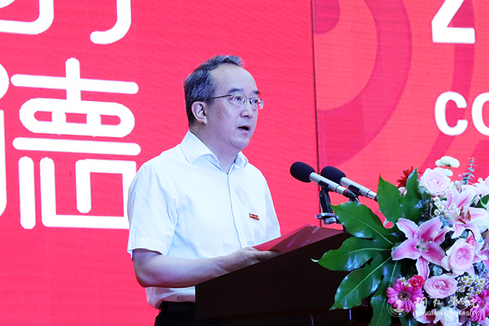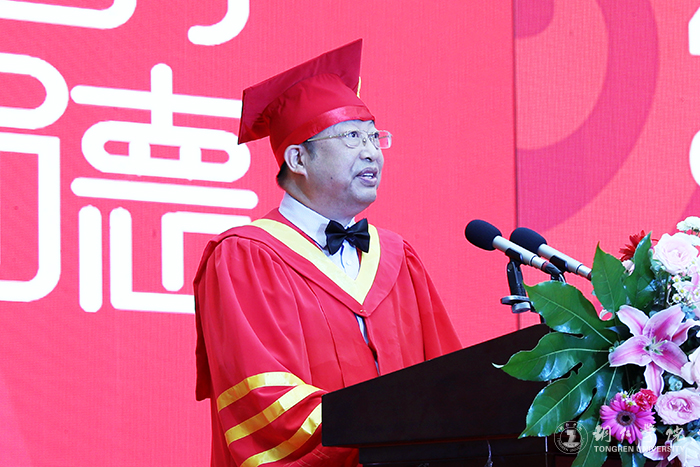 仪式上,侯长林作了讲话。他指出,四年来,2022届的学子秉承青春的责任,在教学楼里孜孜不倦、图书馆里潜心研读、实验室里求真探索、社会服务里跌扑滚爬,用最美的年华生动诠释了大学的理想,让beat365中国唯一官网“苦心励志·追求卓越”的大学精神更加熠熠生辉。他说,大学时光镌刻了独有的青春记忆,如果岁月有年轮,那这段时光里所刻录的故事是深刻而难忘的。毕业是人生一个阶段性的句号,更是全新征程的开始。走向社会,立身的困难远比求学更难,修心的困惑远比校园更多。他对同学们提了三点希望。一是要用责任点亮未来,对自己负责。要在未来的人生征程中,把责任看作磨砺,以对自己负责的态度走好人生的铿锵步伐。二是要用责任点亮未来,为社会担责。要在未来前行的路上,勇于承担社会责任,在波澜壮阔的时代画卷中,奏响澎湃的青春之歌。三是要用责任点亮未来,为国家尽责。要在未来壮阔的人生新征程中,始终心怀“国之大者”,传承好“位卑未敢忘忧国”的情怀,用责任的力量去践行“请党放心、强国有我”的铮铮誓言。