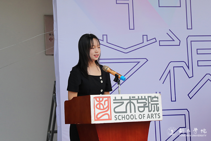 毕业生代表毛佳玲同学在发言中表达了对母校的不舍和对老师的感谢。她说,美术创作与设计创作是冷热水的交替,前期的调研就像冷水的理性冷静,而后期的创新创造需要热水的温度。同学们要做一个传播美好的人,做有情感的绘画,做有温度的设计,在未来的学习和工作上继续创造佳绩,回报社会、回报母校。