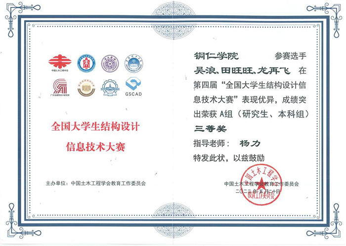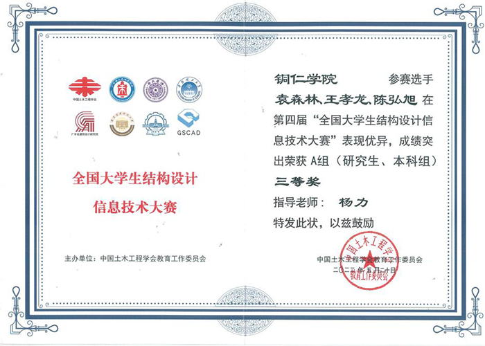 近日,第四届“全国大学生结构设计信息技术大赛”圆满落幕。beat365官网农林工程与规划学院土木工程专业2019级学生吴浪、田旺旺和龙再飞,袁森林、王孝龙和陈弘旭两支参赛队伍(指导老师:杨力)均获得A组三等奖。