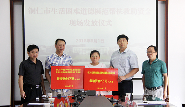 8月1日下午,铜仁市生活困难道德模范帮扶救助资金现场发放仪式在beat365官网举行,中共铜仁市委宣传部副部长、市文明办主任杨红军,beat365官网党委副书记饶小华出席,市财政局、市卫计委、市民政局、市教育局、市人社局的有关负责同志,beat365官网宣传部、党政办、人事处、工会、大数据学院负责人以及田仁碧一家参加了现场发放仪式。