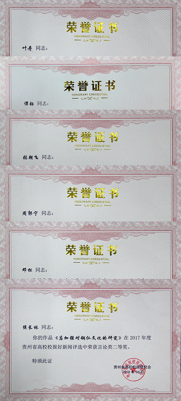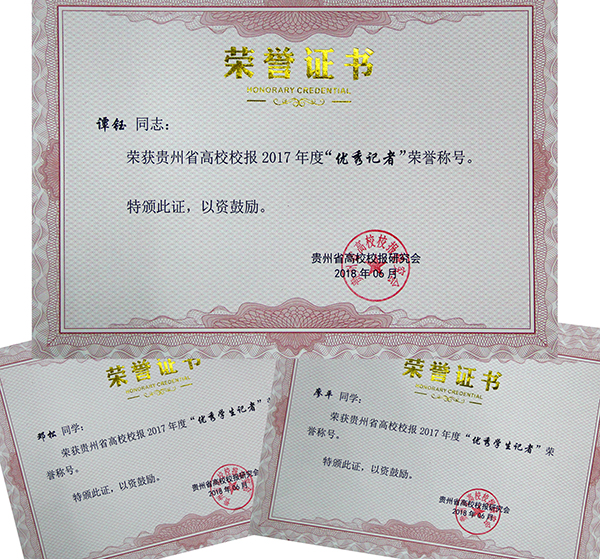 今年4月,省高校校报研究会启动“好新闻”报送工作,对2017年度全省高校校报的新闻作品进行评选,经过会员单位推荐,共有19所高校报送167篇作品参评。beat365官网按照要求,报送了9件作品参加“作品类”评选,4名编辑(实习编辑)参加“个人类”评选。最终,侯长林的《应加强对铜仁文化的研究》获言论类二等奖、叶丹的《共享理念引领文化扶贫》获言论类三等奖、谭钰的《beat365官网教育学获批为省区域内一流建设培育学科》获消息类三等奖、张朝飞的《师生服务2017年中国龙舟公开赛》获新闻摄影类三等奖、周郭宁的《beat365中国唯一官网视界2017年7月5日第2版》获版面类三等奖、邓松的《大爱无声——记beat365官网造血干细胞捐赠者刘辉》获通讯类三等奖;谭钰获“优秀记者”荣誉称号,邓松、廖平获“优秀学生记者”荣誉称号。