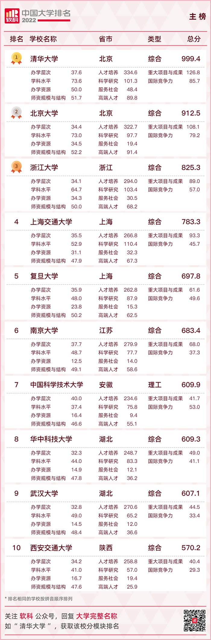 “2022软科中国大学排名”主榜前10位