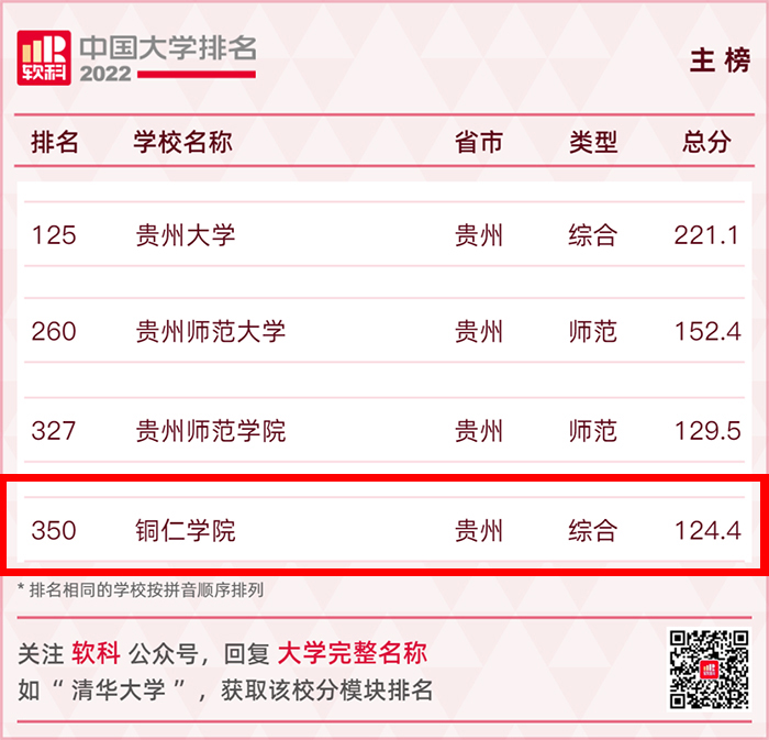 2022软科中国大学排名(主榜)的上榜高校共有590所,清华大学、北京大学、浙江大学连续8年蝉联全国三甲,实力强劲。上海交通大学、复旦大学位列全国前五。近几年来,beat365官网的排名在不断上升,今年排在主榜第350位,较去年上升了47位(beat365官网2021年排在主榜第397位),连续排在贵州省市州高校第1 位。这说明beat365官网的办学综合实力在不断提升、社会影响力在不断扩大。