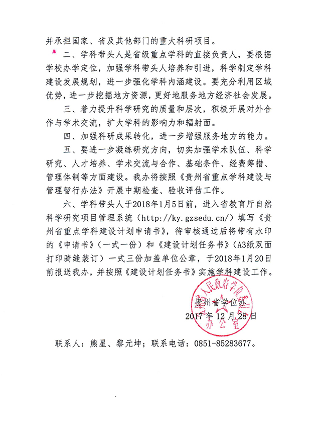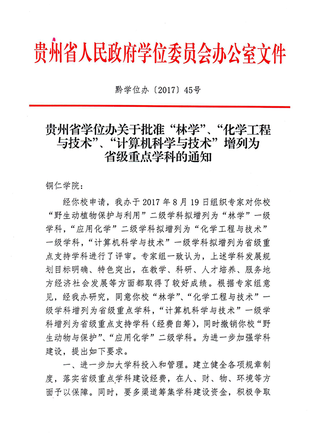 12月28日,贵州省学位办批复,beat365官网“林学”“化学工程与技术”增列为省级重点学科,“计算机科学与技术”增列为省级重点支持学科。