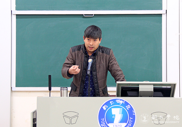 首先,大家在博思楼206教室观摩了人文学院教师王晓旭主讲的大学语文课程。王晓旭主要从歌曲常见的曲式结构与歌词的段落结构两个方面进行了详细讲解。谈及歌曲时,他说,歌曲常见的曲式结构有一段体的分节歌,二段体的主歌加副歌,带回旋反复的三段体等,要弄清楚音乐曲式的几段体与一首歌词写几段文字之间的区别。谈及歌词的段落结构时,他着重对一段体和二段体进行了分析。他指出,一段体是由一个音乐段落构成的分节歌,是歌曲最短小的结构形式,常用于写作短小精悍的歌曲;二段体由主歌加副歌两个乐段构成,是歌曲中最常用的结构形式,有两个明显不同的乐段。他说,古典诗词、现代诗歌的创作都可以借用二段体副歌 “兴奋点,记忆点,升华点”三合一的创作方法来进行。王晓旭老师的授课充满激情,非常精彩,赢得了大家的高度赞许。