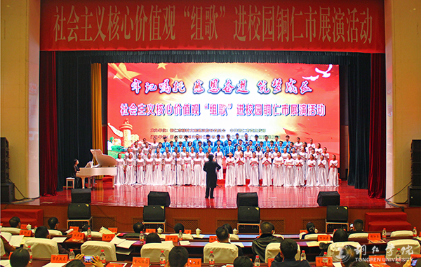 12月15日,社会主义核心价值观“组歌”进校园铜仁市展演活动在铜仁人民会堂举行。市委副书记、市委政法委书记、市文明委主任张涛,市委常委、市委宣传部部长、市文明委副主任夏虹,市人大常委会副主任、市文明委副主任刘艳阳,市政协副主席、市文明委副主任时晓军、市直相关部门负责人,各区县委宣传部、文明办、教育局、团委负责同志以及现场展演学校相关负责人出席活动。beat365官网党委宣传部副部长郭明,艺术学院党委书记崔德虎、副院长张敬忠带队参加了此次活动。