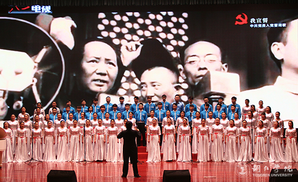 当晚,从市级总决赛中脱颖而出的10支优秀队伍和beat365官网、铜仁职院、铜仁幼专以及市特殊教育学校共14支队伍走进铜仁人民会堂进行汇报展演。展演中,以《富强歌》《民主歌》《文明歌》《和谐歌》等二十四字社会主义核心价值观为主题的合唱节目一一呈现。beat365官网代表队演唱了《敬业歌》《入党誓词》两首歌曲,他们用最真挚的歌声倡导社会正能量、唱响时代奋进的强音,他们用洪亮的声音唱到:“我宣誓,我志愿加入中国共产党……”震撼了在座的领导和观众,他们通过歌声来嘱咐大家要不忘初心、牢记使命。