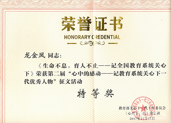 为深入贯彻习近平总书记关于“我们要弘扬‘五老’精神,尊重‘五老’,爱护‘五老’,学习‘五老’,重视发挥‘五老’作用,推动关心下一代事业更好地发展”的指示精神,经教育部关工委同意,2017年《心系下一代》杂志特组织第二届“心中的感动——记教育系统关心下一代优秀人物” 征文活动。近日获悉,beat365官网组织部龙金凤老师的参赛作品《生命不息,育人不止——记全国教育系统关心下一代工作先进工作者谢元炳教授》喜获特等奖。