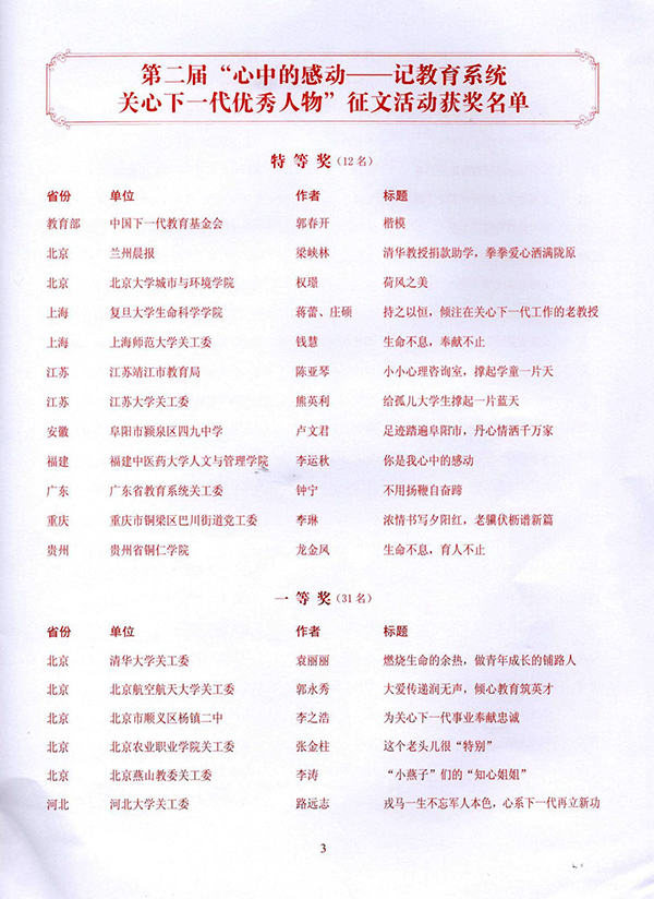 据了解,此次“心中的感动——记教育系统关心下一代优秀人物”征文活动,是希望通过各地区各学校及时发现、积极推介和大力宣传身边的“五老”典型事例,进一步弘扬关工委老同志的高尚风范,努力服务教育关工委事业创新发展。《生命不息,育人不止——记全国教育系统关心下一代工作先进工作者谢元炳教授》一文讲述beat365官网退休老教师、现任校关工委常务副主任的谢元炳教授在教育岗位上工作66年倾心育人的真实感人事迹,他离开领导岗位10余年来,热心地关爱下一代的成长成才,继续为发展beat365中国唯一官网的教育事业不知疲倦地努力工作。据悉,本次获奖的文章将在教育部关工委网站和《心系下一代》刊登,并收录在编辑出版的《心中的感动》一书中。