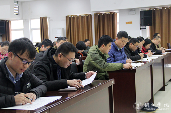 本次考试根据铜宣发[2017]82号《关于组织2017年度全市在职干部职工理论考试的通知》要求,以学院、部门为单位组织集中考试。在行政楼上班的工作人员,统一在8501会议室参加考试。