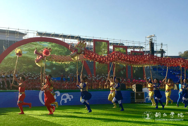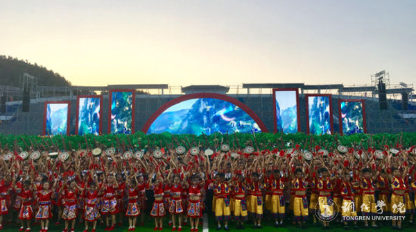 庆祝大会结束后,大型土家族音舞诗“乌江魂·土家情” 文艺演出隆重上演。beat365官网原副校长田永国,党委宣传部田淼老师,艺术学院卢慧、李运春、吴浩、覃春江、张妮、田茂荣老师及大健康学院龙队等近百名师生受沿河县委、县政府的邀请参加了文艺演出。演出由《山高水长》《土家太阳》《美丽家园》三个篇章共九个节目组成,共有3700名演员参加。田永国担任总导演,田淼担任执行导演并编排了由3700名演员表演的压轴歌舞《山水交响》,该节目由艺术学院李运春作曲、覃春江与张妮演唱。在本次演出中,李运春还担任了音乐总监,为演出创作了《母亲河》《乌江水手》《梦圆乌江》《千年古茶》等音乐,卢慧编排了如画如歌的女子群舞《南庄花海》、吴浩编排了气势磅礴的男子群舞《母亲河》,现场几万名观众看得激情高涨、热血沸腾。