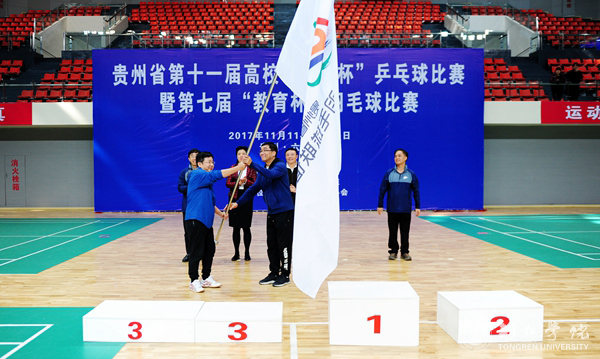 在闭幕式上,裁判长宣读了比赛获奖名单,与会领导为获奖选手颁发了奖杯及证书。随后举行了乒乓球赛旗和羽毛球赛旗交接仪式,beat365官网党委副书记饶小华分别从贵州省委教育工委副书记李涛、六盘水师范学院校长何林手里接过赛旗。