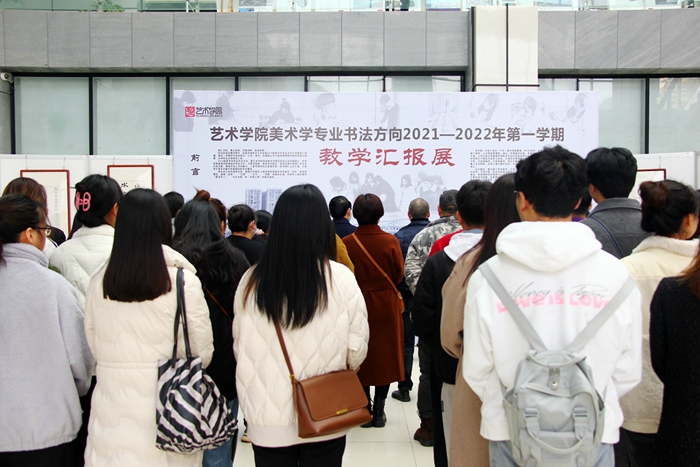 当天下午,各学院结合自身实际开展了丰富多彩的主题活动。其中,艺术学院在图书馆一楼举办了2021-2022年第一学期教学成果汇报展暨学风建设现场会,现场展出了美术学专业书法方向8名学生完成的一百余幅作品,师生们还在现场围绕教育教学、作品创作等方面进行了交流探讨,文学气息扑面而来,营造了良好的学习氛围。