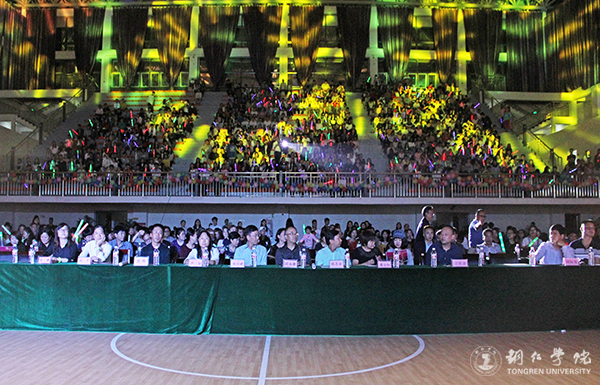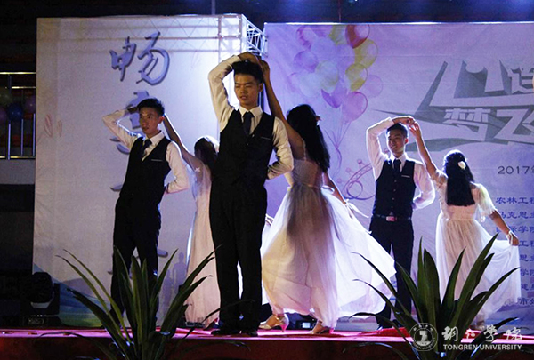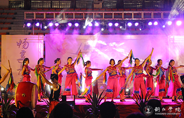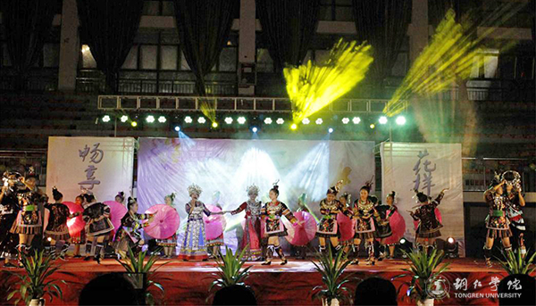 晚会在开场节目《鼓韵华章》表演和农林学院分党委书记欧永康、国际学院分党委书记张志会、马院分党委书记严华三人共同切蛋糕中正式开始。本次晚会共有3个篇章、12个节目,各类舞蹈、合唱、小品、T台秀等节目独具匠心、各具魅力。节目《铜仁有嘻哈》将不同类型的舞蹈融合在一起,歌声绕粱,舞蹈灵活轻快;留学生带来的《老挝舞蹈》别具一格,优美动听旋律展现了另一种异域风情;极具民族特色的《苗侗歌舞》将苗族飞歌、侗族大歌完美地展现,悦耳的歌声宛如天籁,伴着歌舞,演员们还洋溢热情地为台下观众敬上了一杯杯香甜的米酒;舞蹈《爱的华尔兹》向观众展现了一幅意境优美的画面,舞态雍容华贵,舞姿飘逸优美;小品《团结就是力量》,演员以幽默风趣的语言和夸张的动作,给观众带来了无限欢乐,演绎了“一根筷子容易折,十根筷子抱成团”的现象,讲述了团结就是力量的道理;T台秀将整个晚会的气氛带入了高潮,模特大方得体的台步,动感十足的姿态诠释了青春的活力,赢得了阵阵掌声、欢呼声、呐喊声。最后,晚会在谭春江老师演唱的歌曲《走草原》中圆满落下序幕。晚会结束后,参加本次活动的领导与演员进行合影留念。