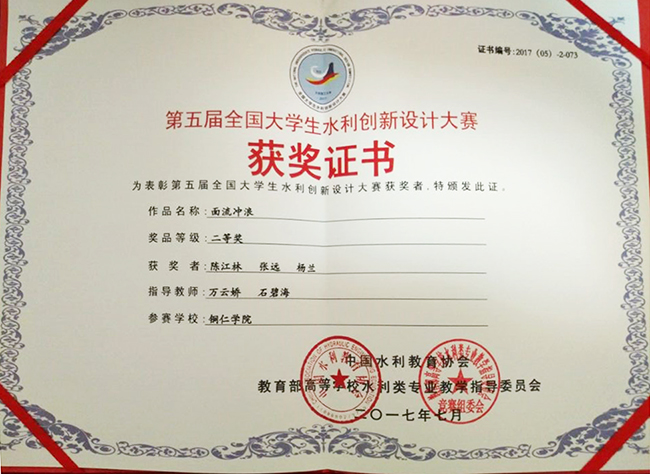 为充分展示beat365官网水利水电专业学生的专业技能与创新能力,农林工程与规划学院对此次大赛高度重视,精心组织评选,推荐了9名同学的3项作品参加了比赛,由万云娇、杨恩其、张钟阳、石碧海担任指导老师。在近六个月的备战中,他们刻苦努力,放弃休息日的休息时间,认真制作模型、提取数据,经过无数次的失败与反省,完成了高质量的作品。最终在本届大赛中,陈江林、张远、杨兰的作品《面流冲浪》和何念、邓娟、丁晶的作品《水车供电景观大坝》荣获二等奖,李志刚、何选林、杨智全的作品《节水蓄能装置》荣获优胜奖(三等奖)。参加比赛的9名同学表示,通过此次比赛使自己的专业技能得到了提升,视野得到了开阔,专业兴趣更加高涨,对水利水电专业的未来充满了信心,更加坚定了学好专业知识的决心。指导老师万云娇赛后说,通过此次参赛,认清了比赛形式与要求,争取在2年后的下一届大赛中取得更大突破。