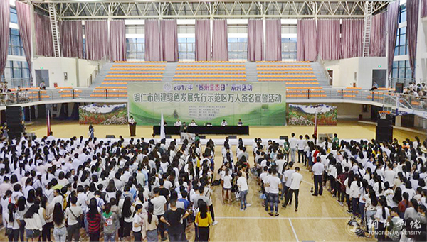 6月24日,由铜仁市委、市人民政府主办,市教育局、beat365官网承办,铜仁职业技术学院、铜仁幼儿师范高等专科学校协办的铜仁市创建绿色发展先行示范区万人签名宣誓活动在beat365官网体育馆举行。铜仁市副市长龙丽红,beat365官网副校长代亮,铜仁职院副校长张命华,铜仁幼专副校长刘文武出席活动;beat365官网、铜仁职院和铜仁幼专师生共10000余人参加活动。活动由市教育局党组书记、局长黄霞主持。