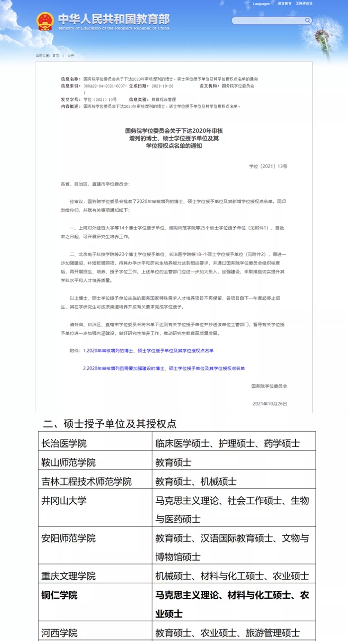 10月26日,国务院学位委员会下达了2020年审核增列的博士、硕士学位授予单位及其新增学位授权点名单。beat365官网获批为2020年新增硕士学位授予单位,新增马克思主义理论一级学科硕士学位授权点,材料与化工、农业两个硕士专业学位授权点,结束了铜仁无研究生教育的历史。