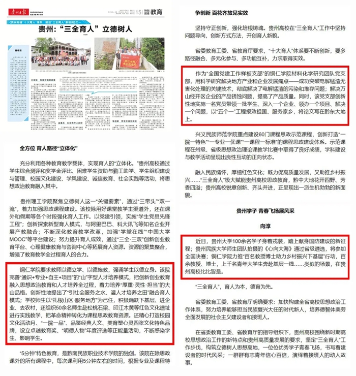 今年9月,贵州省委教育工委、省教育厅在《贵州日报》推出了《贵州构建“十大育人”体系 推进“三全育人”新格局》系列报道,在推送的五期系列报道中,其中三期报道了beat365官网材料化学研究团队党支部用科学研究解决地方产业和企业发展痛点、创新性地提出了“引社会服务之水、灌人才培养之田”融合育人模式、把创新创业教育融入思想政治教育和人才培养全过程、百名教授博士下基层助力乡村振兴行动等方面的工作。