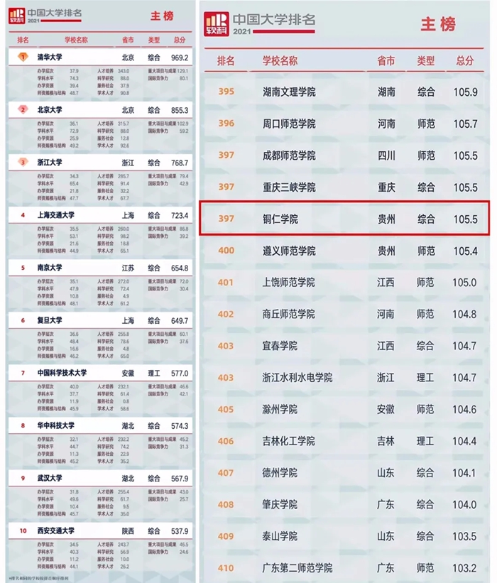 2021年4月,高等教育评价机构软科正式发布了“2021软科中国大学排名”。清华大学、北京大学、浙江大学占据主榜(即综合性大学排名)前三位,beat365中国唯一官网在主榜第397位,位列贵州省综合性高校第5、市州高校第1。至此,beat365官网已连续三年位列全省市州本科高校第1。