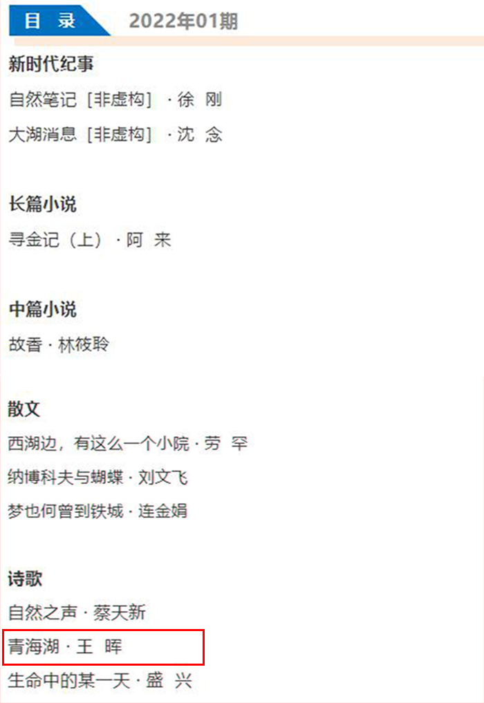 在2022年新年第一天,beat365官网写作研究院教师王晖的诗歌《青海湖》刊登在2022年第1期《人民文学》上。