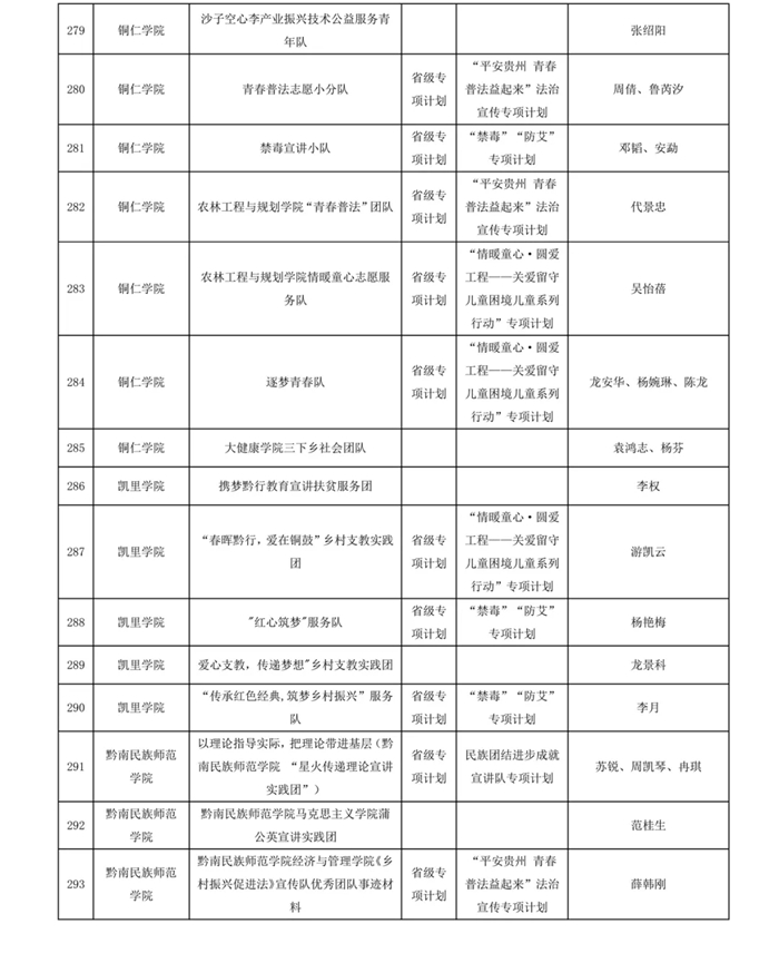其中,“互联网+云端助农”团队,通过新媒体技术,下沉基层为沿河沙子果农解决尾果滞销难题,以直播带货的形式销售空心李,三场公益直播共计吸引了35000余人次观看,收获评论1000余条,果园滞销尾果通过公益直播销售一空,该团队除获省级优秀团队外,同时获得全省优秀项目。“青马班理论宣讲队”“马克思主义学院理论宣讲队”,两支队伍先后前往松桃、思南、石阡等地开展习近平总书记“七一”重要讲话理论宣讲,深入民族地方及偏远乡村开展入户宣讲、苗汉双语宣讲10余场,入户调研100余户,发放宣传资料500余份,宣讲群众500余人。四支普法宣传队、一支禁毒宣传队先后来到滑石乡、平塘县、灯塔街道开展普法宣传和禁毒宣传活动,过程中入户讲解200户、发放宣传资料600份、露天宣讲群众1200余人。