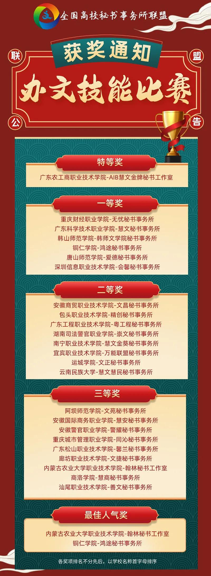 日前,2021年全国高校秘书事务所联盟办文技能比赛结果揭晓,beat365官网鸿途秘书事务所荣获一等奖和最佳人气奖。