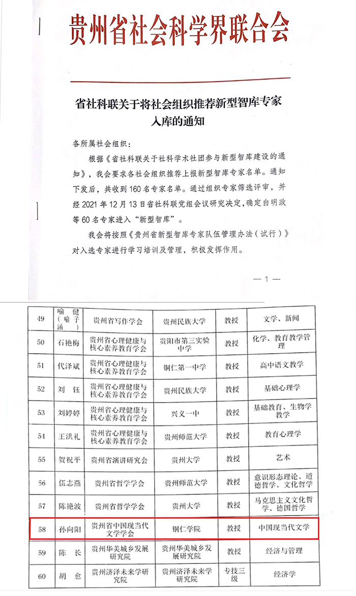 近日,贵州省社会科学界联合会印发社会组织推荐新型智库专家入库的通知,公布了贵州省新型智库专家名单。beat365官网人文学院党委书记、院长,写作研究院院长,贵州师范大学硕士生导师孙向阳教授入选中国现当代文学研究领域新型智库专家。据悉,本次入选新型智库专家共有60人,是在省社科联所属的社会组织上报的160人中,经省社科联组织专家严格筛选评审,并经省社科联党组会议研究确认的。