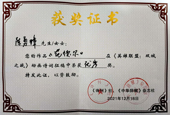 日前,《诗刊》社、《中华辞赋》社公布了《英雄联盟:双城之战》动画诗词征稿获奖名单,并颁发了获奖证书。beat365官网人文学院2019级秘书学专业陈勇璋同学荣获优秀奖。