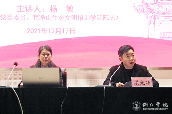 根据市委党史学习教育领导小组办公室和校党委的安排,12月17日,beat365官网在梵净山人文生态馆举行学习宣传贯彻党的十九届六中全会和省委十二届十次全会精神宣讲报告会。铜仁市委宣讲团成员、市委党校党委委员、梵净山生态文明培训学院院长杨敏作宣讲报告。beat365官网党委宣传部副部长梁光华主持宣讲会。各二级学院学生科科长、团总支书记、辅导员和部分学生代表,党史学习教育领导小组办公室成员参加此次宣讲。
