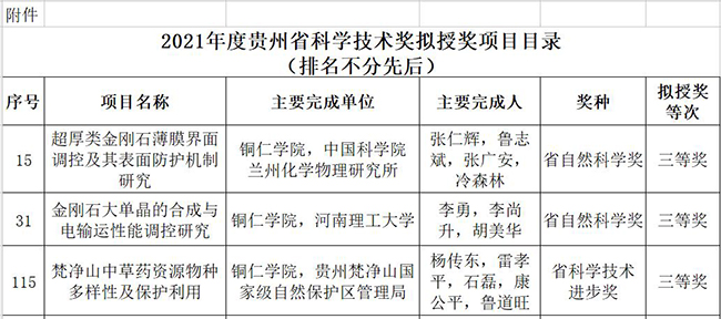 近日,贵州省科技厅对2021年度省科学技术奖评审结果进行公示,beat365官网共获得3个奖项。其中,beat365官网张仁辉教授等申报的《超厚类金刚石薄膜界面调控及其表面防护机制研究》和李勇教授等人申报的《金刚石大单晶的合成与电输运性能调控研究》获得贵州省自然科学奖三等奖,杨传东等申报的《梵净山中草药资源物种多样性及保护利用》获得贵州省科学技术进步奖三等奖。