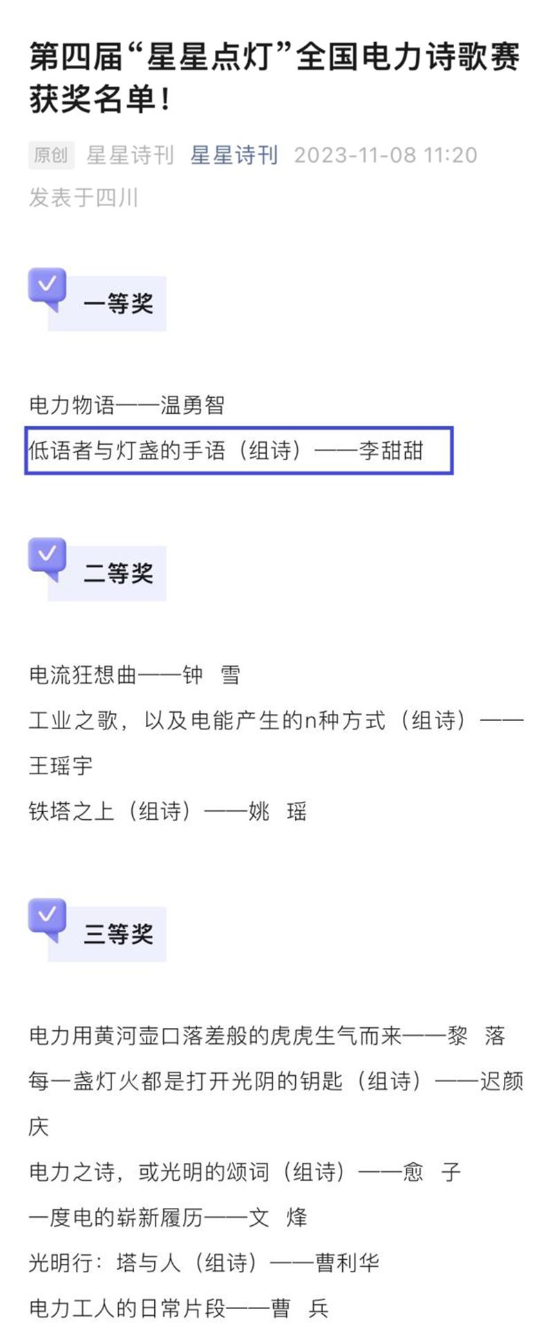 11月8日,第四届“星星点灯”全国电力诗歌赛获奖名单正式揭晓,beat365官网文学与传媒学院2020级汉语言文学专业学生、晨光文学社社员李甜甜的诗歌《低语者与灯盏的手语》(组诗)从万余首参赛作品中脱颖而出,斩获一等奖。