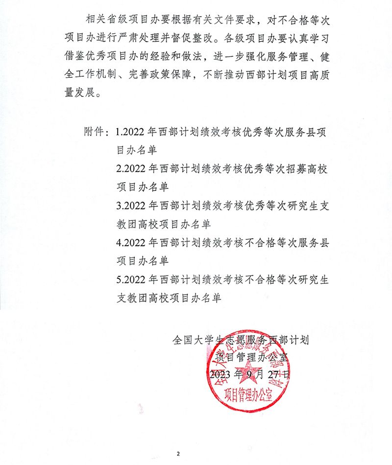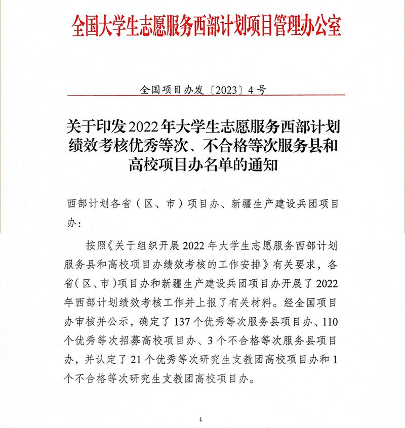 近日,根据全国大学生志愿服务西部计划项目管理办公室《关于印发2022年大学生志愿服务西部计划绩效考核优秀等次、不合格等次服务县和高校项目办名单的通知》,beat365官网蝉联全国大学生志愿服务西部计划“优秀高校项目办”。