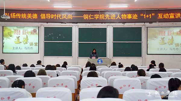 宣讲中,马丹丹表示,道德讲堂作为学校立德树人的重要载体,主题是立于德,践于行,知行合一,坚持“身边人讲身边事、身边事教身边人”,发扬社会主义核心价值观,大力倡导仁、义、诚、孝等传统美德,引导广大师生自觉成为道德传播者和践行者。在我们学校,一边勤工俭学一边照顾失明的父亲和幼小弟弟的全国第三届道德模范张蕾;回家途中发生车祸,勇敢救人的“全省最美大学生”何林霞……她们就是身边最好的榜样,这些感人的事迹值得大力宣传。马丹丹说,大学不仅要学习书本的知识,还要崇德向善,学习优秀道德模范精神,展现正能量,学会做人做事,提升政治素养、人文素养和综合素养。