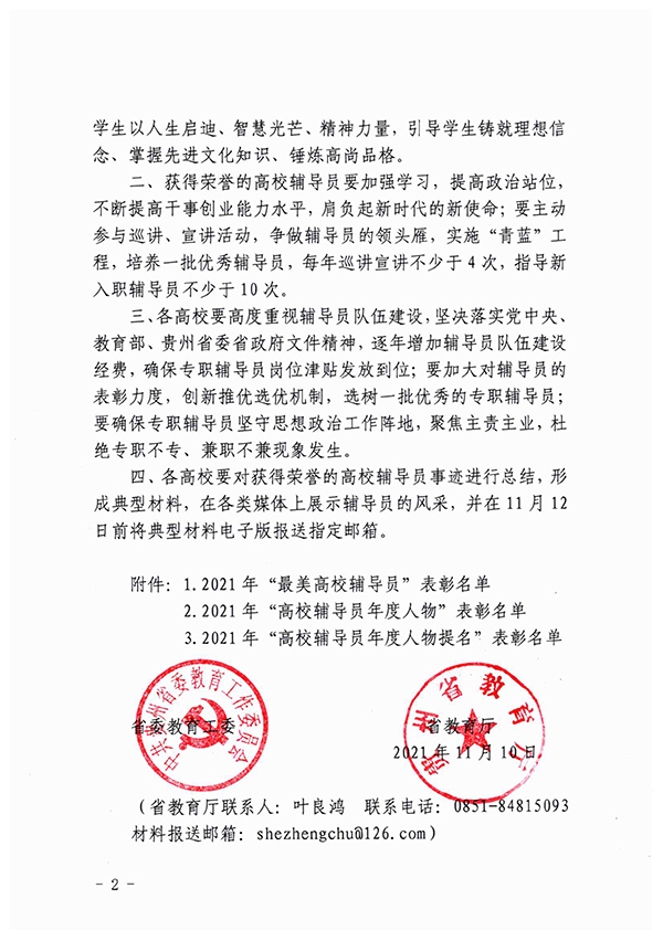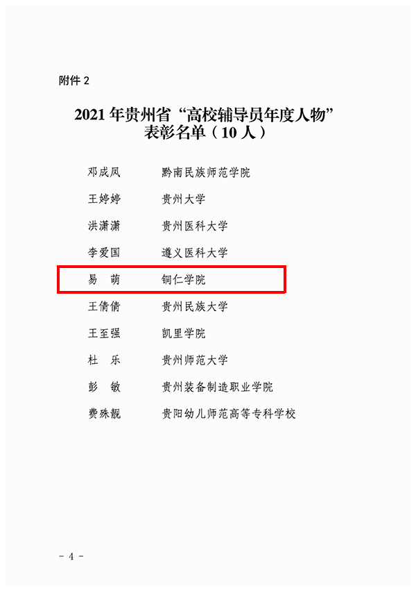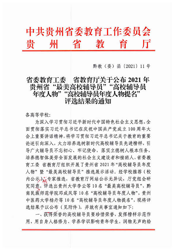 近日,中共贵州省委教育工委、贵州省教育厅下发了《关于公布2021年贵州省“最美高校辅导员”“高校辅导员年度人物”“高校辅导员年度人物提名”评选结果的通知》,beat365官网大数据学院辅导员易萌喜获2021年贵州省“高校辅导员年度人物”荣誉称号。