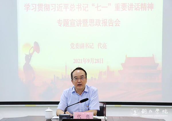 9月28日,校党委副书记代亮到人文学院作习近平总书记“七一”重要讲话精神专题宣讲暨思政报告。人文学院党委书记、院长孙向阳,副院长张建刚、蒋小红及党务科负责人、师生党员代表、辅导员代表、学生代表40余人参加报告会。
