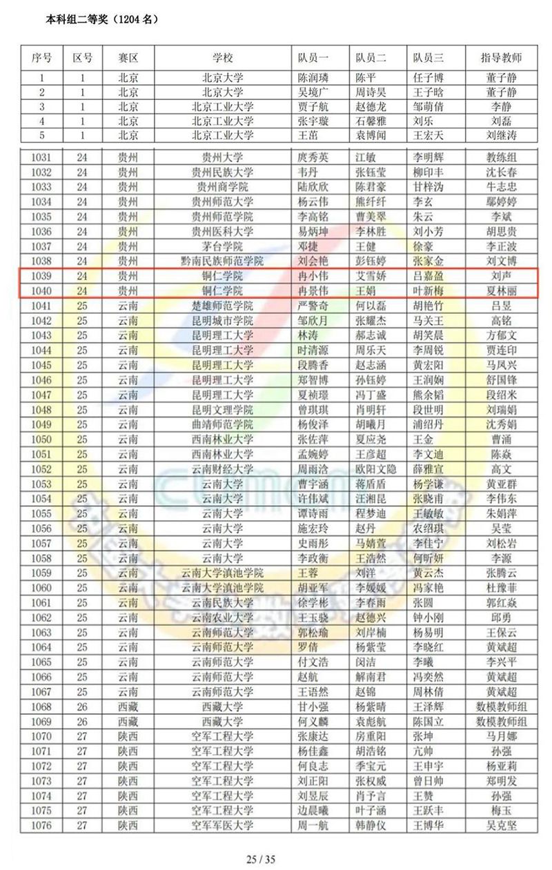 近日, 由教育部高教司和中国工业与应用数学学会举办的2024年高教社杯全国大学生数学建模竞赛成绩揭晓,beat365官网大数据学院刘声老师指导的冉小伟、艾雪娇、吕嘉盈团队,夏林丽老师指导的冉景伟、王娟、叶新梅团队,均荣获国家级二等奖。此外,在贵州赛区中,beat365官网参赛队还收获了多项省级一、二、三等奖。
