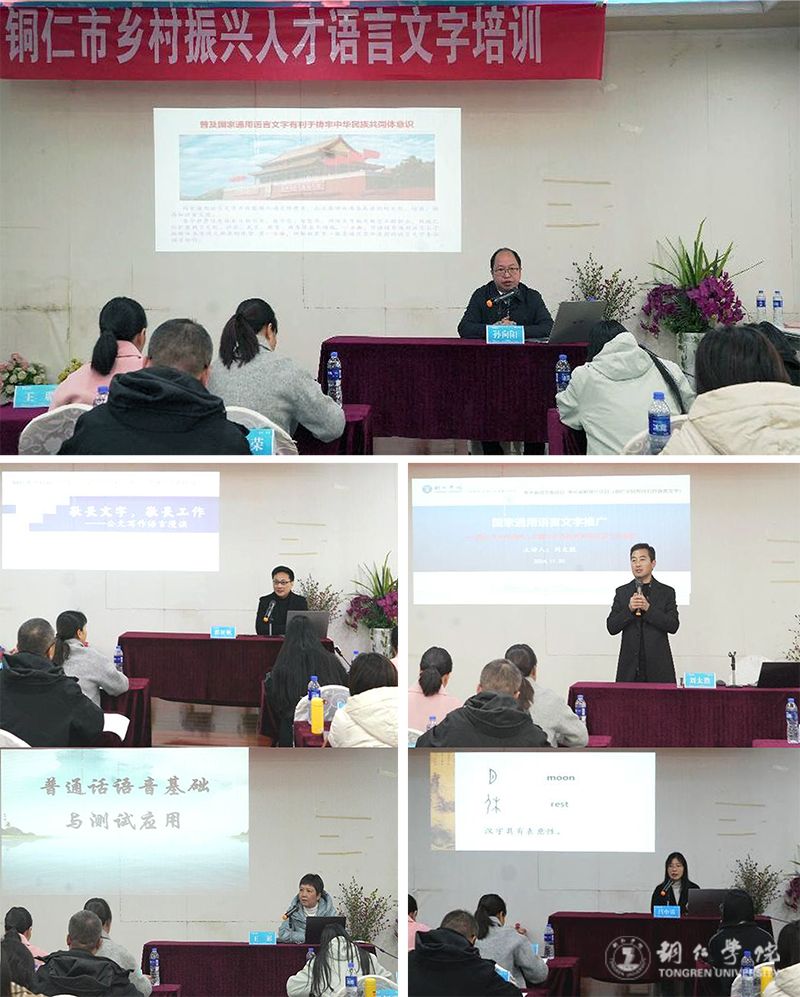 培训期间,孙向阳作了题为《普及国家通用语言文字与铸牢中华民族共同体意识》的主题讲座,为全体学员解读了党的二十大、党的二十届三中全会关于语言文字、乡村振兴、高质量发展的相关内容,传达了习近平总书记的重要讲话和重要指示批示精神,深入浅出地讲解了普及国家通用语言文字与铸牢中华民族共同体意识之间的关系。文学与传媒学院教师刘太胜、王彬、吕小雷、郭征帆分别从国家语言文字法律法规及标准,推广普及国家通用语言文字的意义、依据、任务、措施和方法,普通话的基本知识、发音要领和测试应用,汉字与中国文化的关系,乡村振兴人才应用文写作规范等方面作了专题讲座。