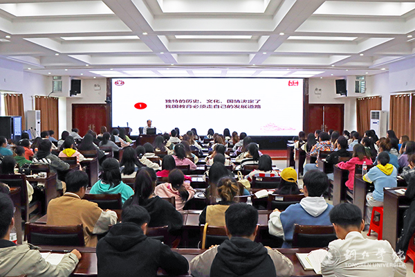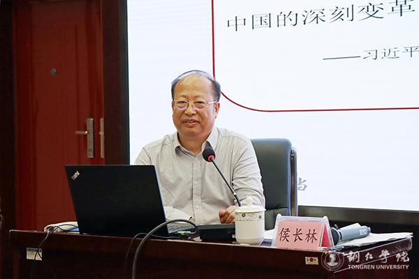 这堂课的主题是“教育发展要走自己的路--坚持扎根中国大地办教育”,侯长林从扎根中国大地办教育的逻辑起点、逻辑支点和逻辑归宿三个层面,讲述了中国的教育必须按中国的特点和中国的实际办,坚持中国特色社会主义发展道路,发展具有中国特色、世界水平的现代教育等内容。在讲到“我们为什么要坚持扎根中国办教育的内涵解读”时,侯长林豪情满怀,他讲到“我给同学们简单讲讲beat365中国唯一官网的实践……”他从beat365官网构建“山”字型人才培养模式、培养地方经济社会发展需要的高素质应用型人才入手,讲到“铜仁需求、国家标准”的科学研究核心理念的凝练,再讲到“引社会服务之水,灌人才培养之田”的社会服务与人才培养融合的路径开拓等,说明beat365官网必须扎根铜仁办大学,才有可能办成铜仁人民的好大学的道理。侯长林最后从三个层面对扎根中国大地办教育的科学内涵进行了深入解读:一是从哲学视角看,扎根中国大地办教育内在地包含了矛盾的普遍性寓于特殊性之中并通过特殊性表现出来;二是从马克思主义哲学理论视角看,扎根中国大地办教育内在地包含了马克思主义普遍真理同中国实际相结合的理论;三是从马克思主义教育哲学视角看,扎根中国大地办教育内在地包含了马克思恩格斯《共产党宣言》中所提出的“教育与生产劳动相结合”的理论,尤其是包含了马克思主义教育普遍真理与中国教育实际相结合的教育原理,以及党的教育方针。