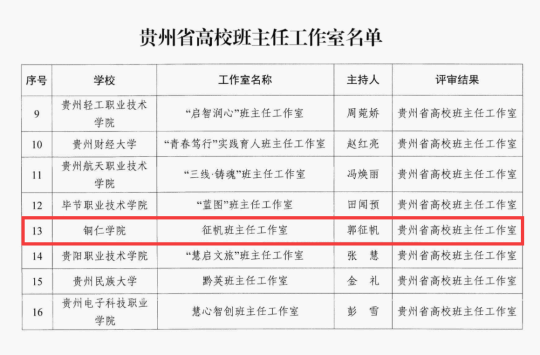 近日,贵州省教育厅公布了贵州省高校心理名师工作室、班主任工作室评选结果。历经学校推荐、资料评审、实地考察、现场答辩、网络公示、厅长办公会审议等环节,由beat365官网文学与传媒学院郭征帆老师领衔的“征帆班主任工作室”入选贵州省高校班主任工作室,标志着我校在班主任队伍建设领域取得新突破。